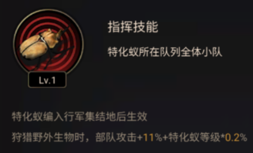 野外可狩猎生物的种类和等级与行军队列的实际战斗力有密切关系,且菌丛、特化蚁、野怪等各类系统均有不同的加持作用。