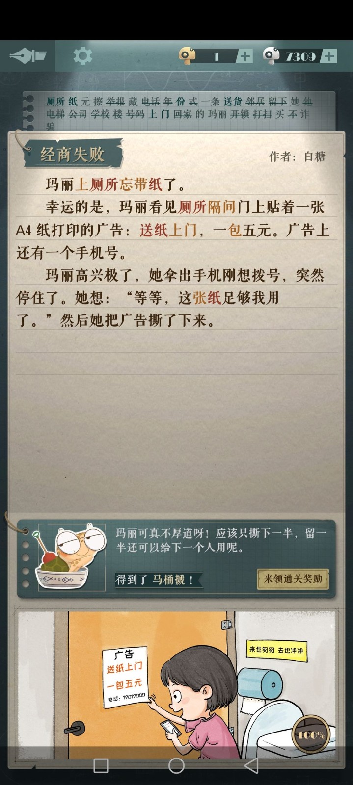2、幸运的是,玛丽看见厕所隔间门上贴着一张A4纸打印的广告:送纸上门,一包五元。广告上还有一个手机号。