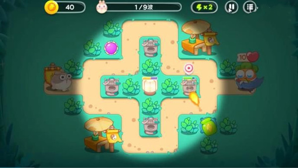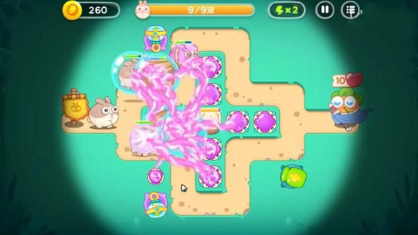 2、中期的时候障碍物清理七七八八,在中间位置建造魔法球,左上角泡泡塔。