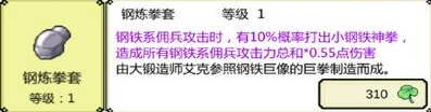 钢铁系佣兵攻击时,有10%概率打出小钢铁神拳,造成所有钢铁系佣兵攻击力总和*0.55点伤害。